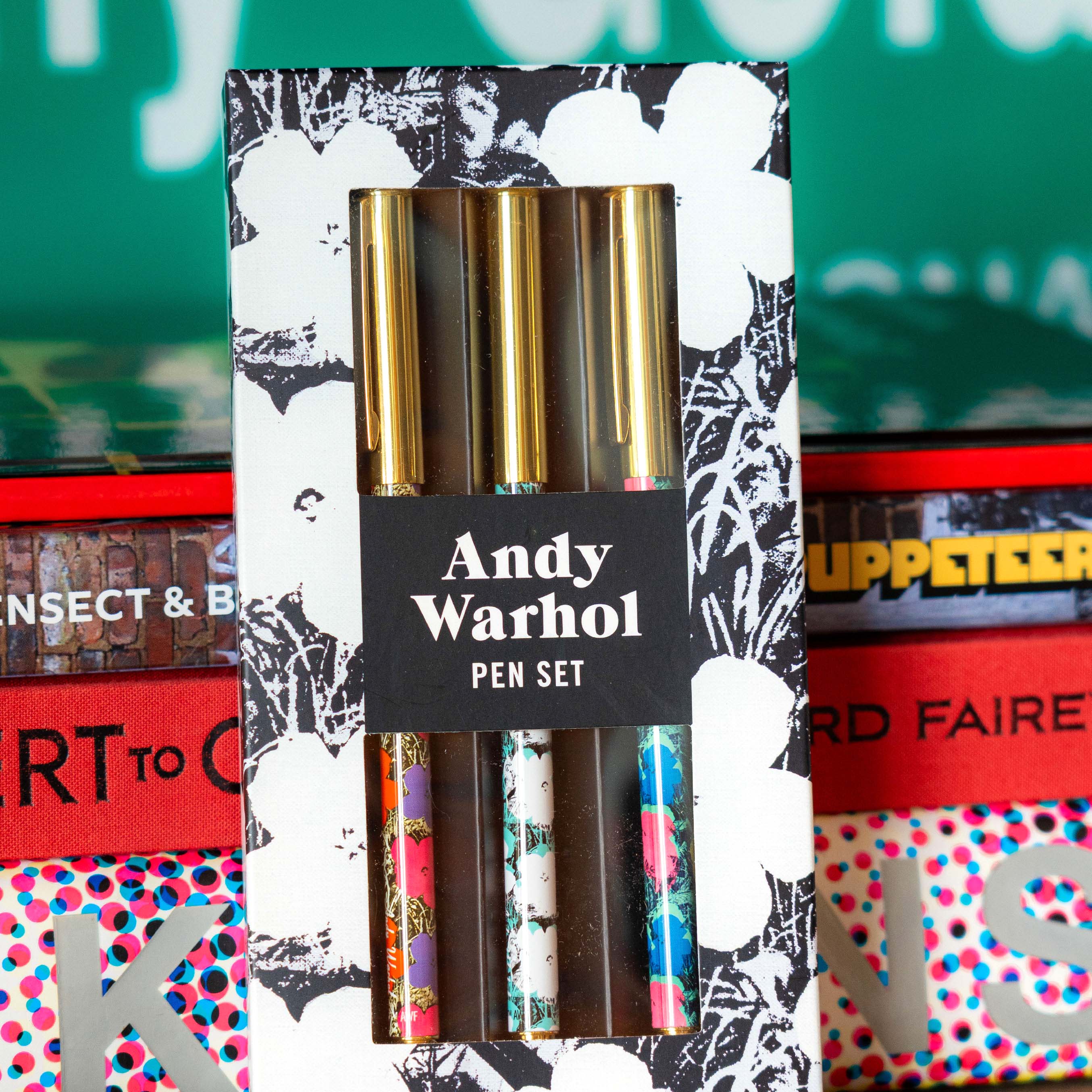 Bring a touch of art to your writing with the Andy Warhol Flowers Everyday Pen Set. Featuring Warholâs iconic Flowers print, this set of three black ballpoint pens is designed for style and function. Each full-color printed metal barrel is paired with a metallic gold cap, creating a sleek and sophisticated writing tool for any art lover.