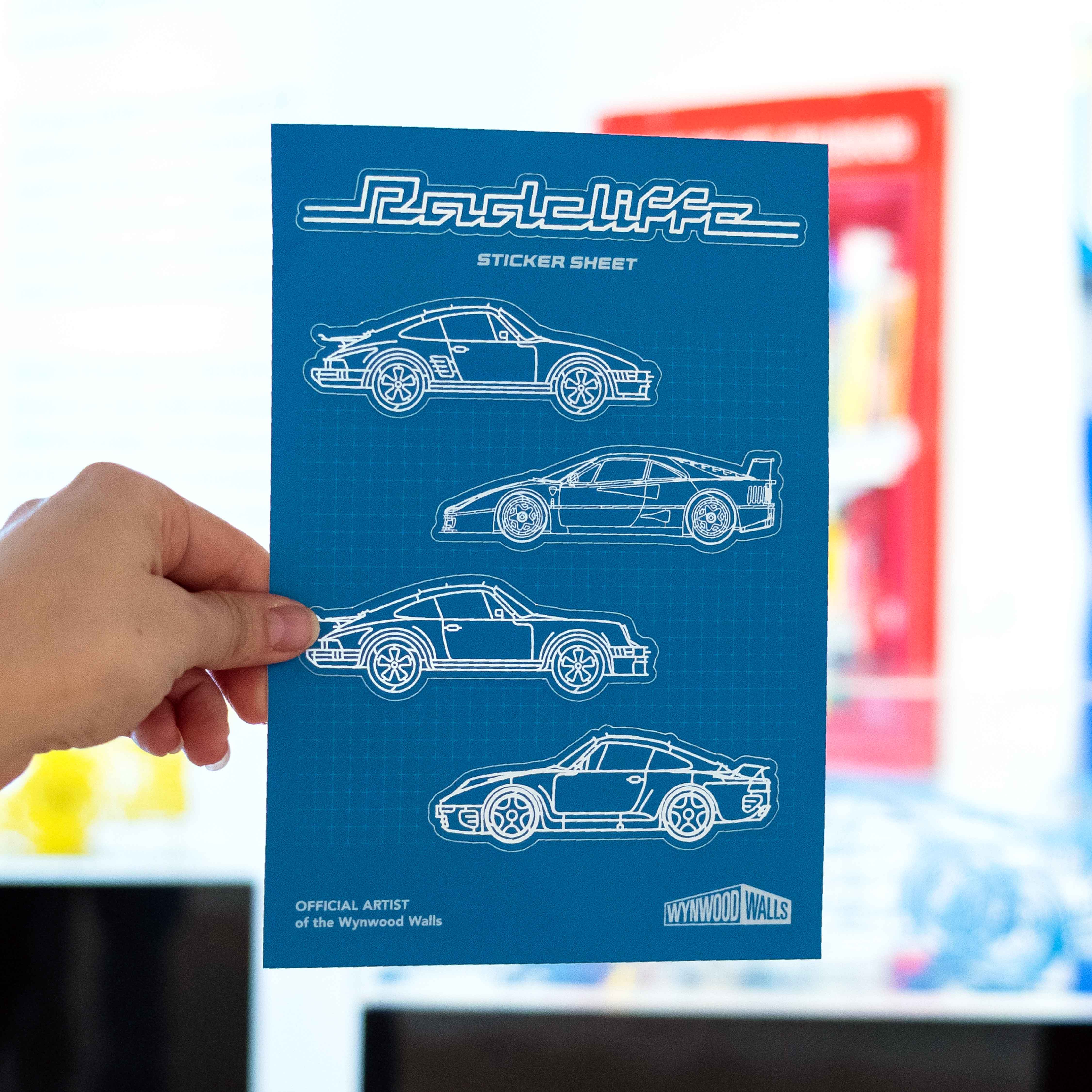 Celebrate bold urban creativity with the Benedict Radcliffe Sticker Sheet, an exclusive release from Wynwood Walls Shop. This A5-sized sheet (5.8â x 8.3â) features five die-cut holographic stickers printed on matte material, blending vibrant edge-to-edge designs with Radcliffeâs iconic style inspired by automotive forms and cityscapes.