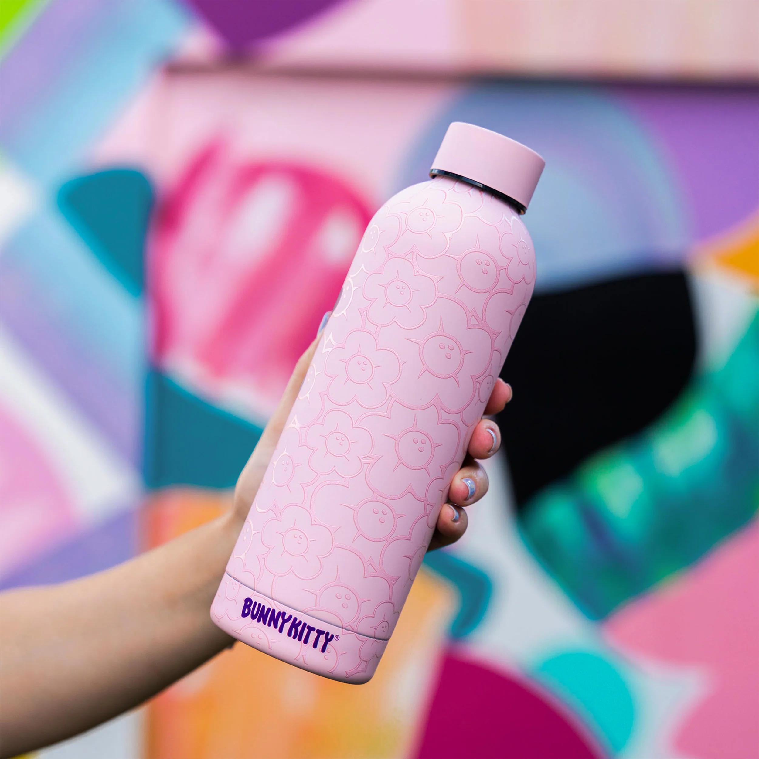 Elevate your hydration game with the Bunny Kitty LEAP Water Bottle 17oz/500mL x Wynwood Walls. This isn't just a water bottle; it's a canvas showcasing contemporary graffiti art by the renowned street artist Persue. Featuring his iconic Bunny Kitty character leaping across vibrant urban landscapes, this piece brings the energy of street art into your daily routine.