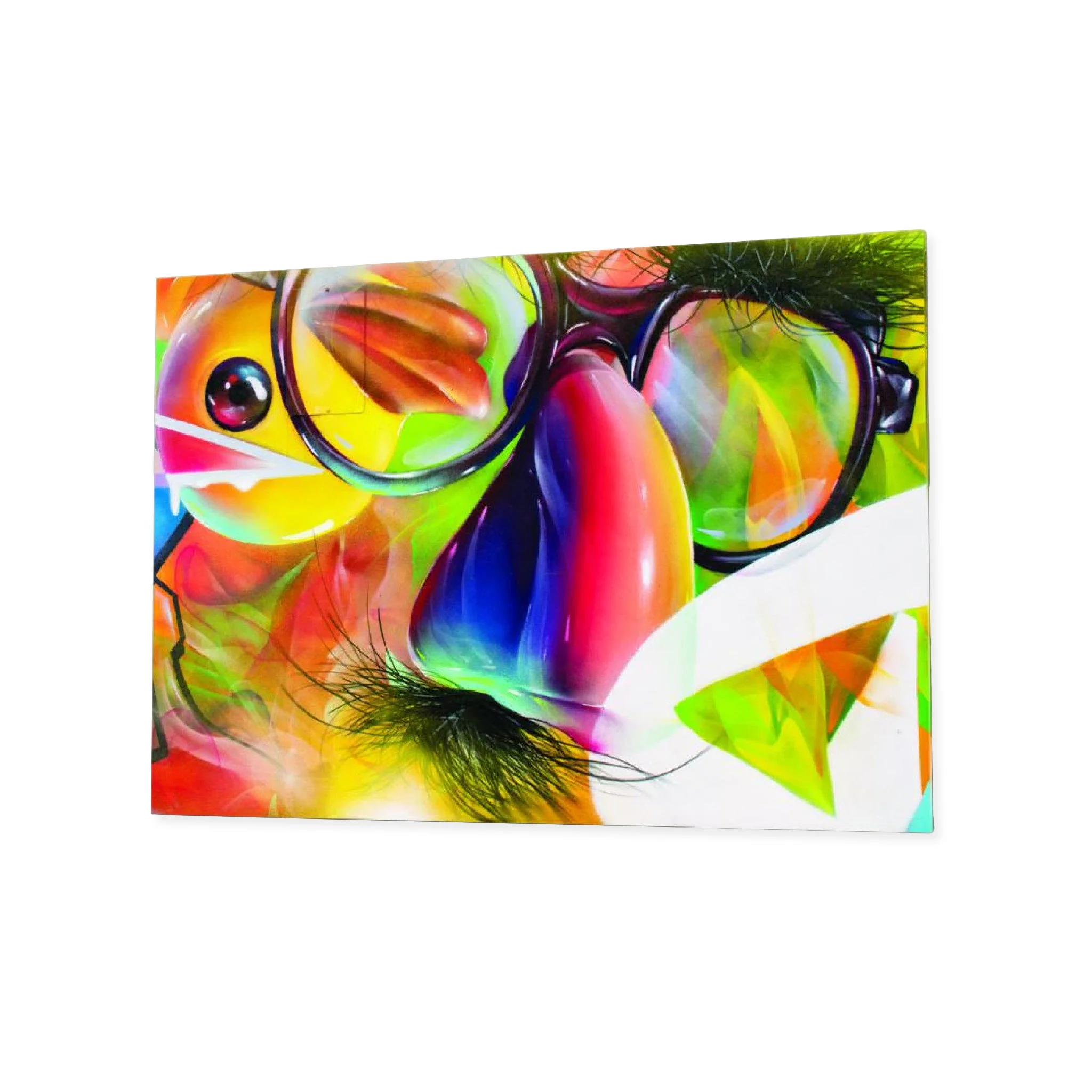 Hiero’s unique perspective and experience of light and color is reflected in his distinctive compositions. His current personal work style involves abstract backgrounds and kaleidoscopic designs with Groucho glasses, chattering teeth, and rubber ducks.