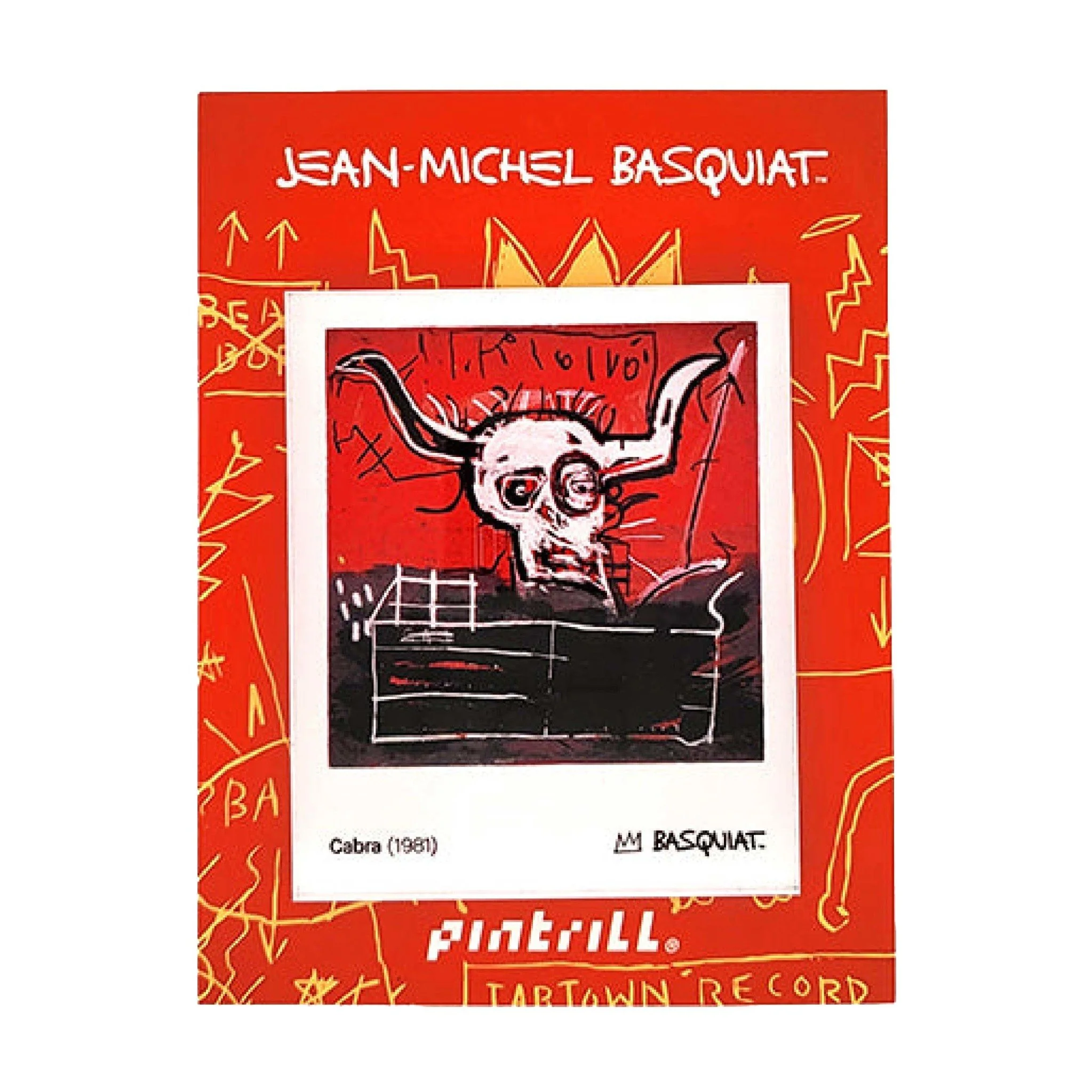 The Jean-Michel Basquiat CABRA Magnet showcases a striking visual featuring a bull's skull against a vibrant red background. This design exemplifies Basquiat's distinctive style, characterized by its raw brushwork and bold contrast. The magnet is constructed from durable materials, making it suitable for display on any magnetic surface.