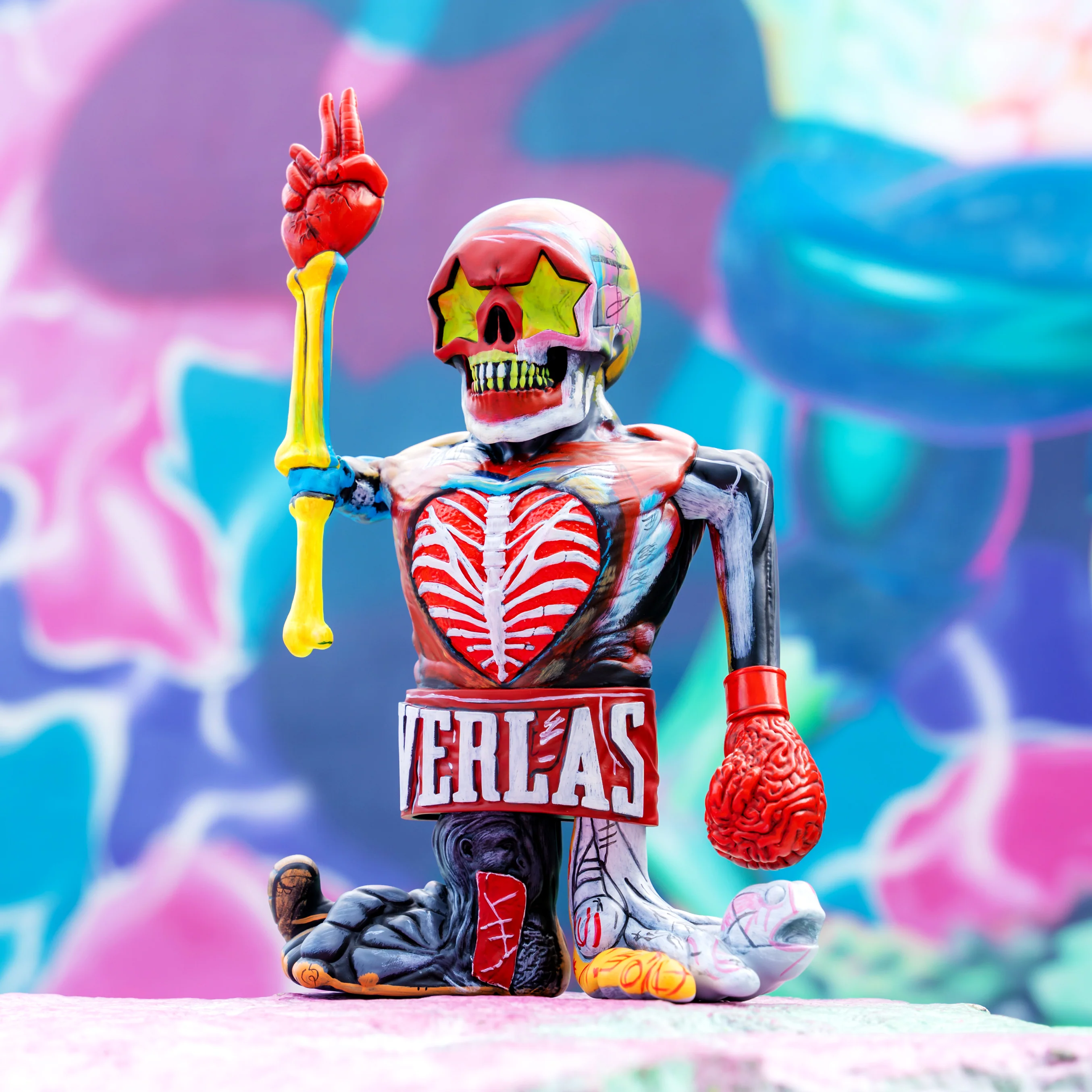 A Ron English character figure built like a surreal prizefighter, with a crowned skull head, star shaped eyes, and a wide grin of neon teeth. The torso is painted with an exposed ribcage and a red heart motif, while the waist reads EVERLAST in bold block letters like a championship belt. One arm lifts a peace sign with a bright yellow bone forearm, the other ends in a red brain fist, with mismatched legs and oversized feet that add to the stitched together, street pop energy.